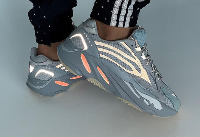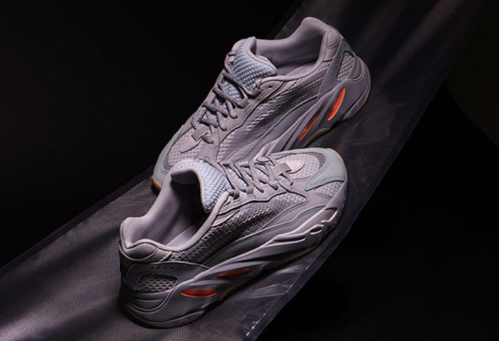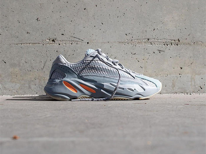 这款鞋几乎是沿用了之前“惯性”配色Yeezy Boost 700的设计方案,更具流线型的设计,深浅灰色皮革和网面的搭配,在珊瑚橙色以及鞋身侧边3M 反光条的配合下,让鞋款上脚效果十分的出众。