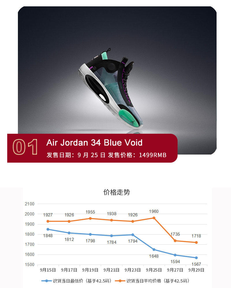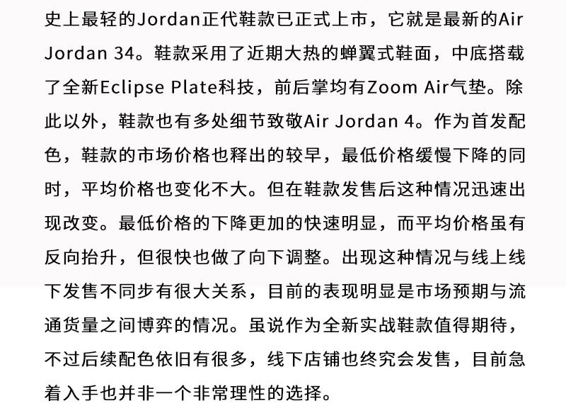 上周鞋款的发售密度依旧很大,特别是实战鞋款有大放异彩的态势,备受瞩目的Air Jordan 34、LeBron 17以及Harden Vol.4几乎同期登场,而经历跳票的“头等舱”Air Jordan 1也如约而至,更不要说Air Jordan 12和Yeezy Boost 700 V2也都有新配色的推出,而这些鞋款目前的价格走势如何,本期内容继续为大家呈现。