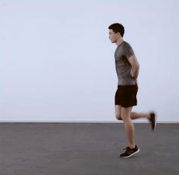 行进勾腿跳:勾腿,并尽力向臀部靠近,双手垫在臀部。勾腿的过程中向前进,保持一定的速率。每次两组,一组10米左右。