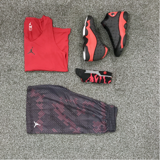 最后一套是鉴于Air Jordan 13 “Bred”的运动性质搭配的实战套装。和日常装束不同,我们在球场上会选用更加炸眼的颜色在球场强调存在感,所以这套装束的主色调自然就是红色了。