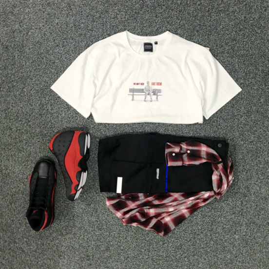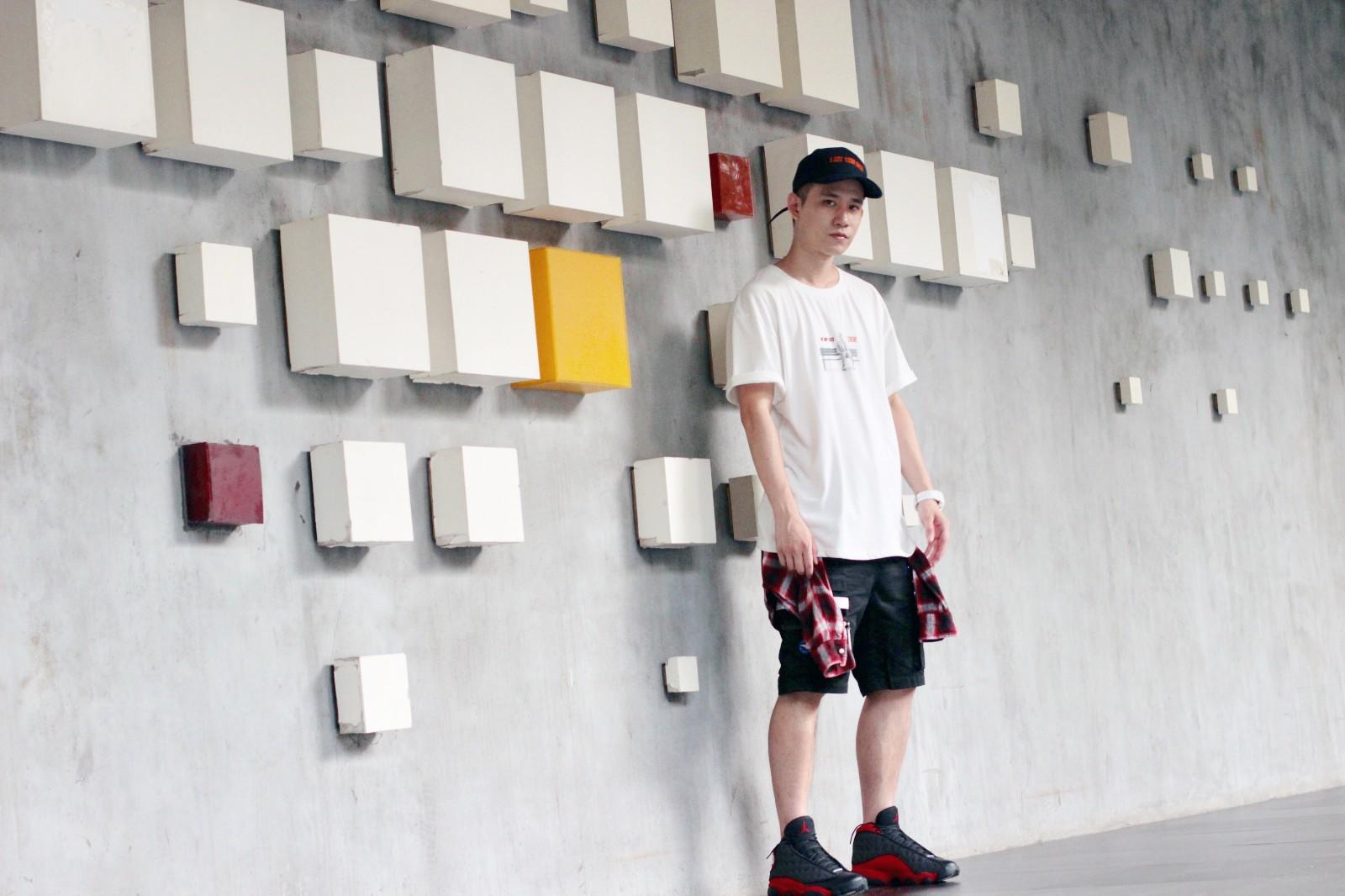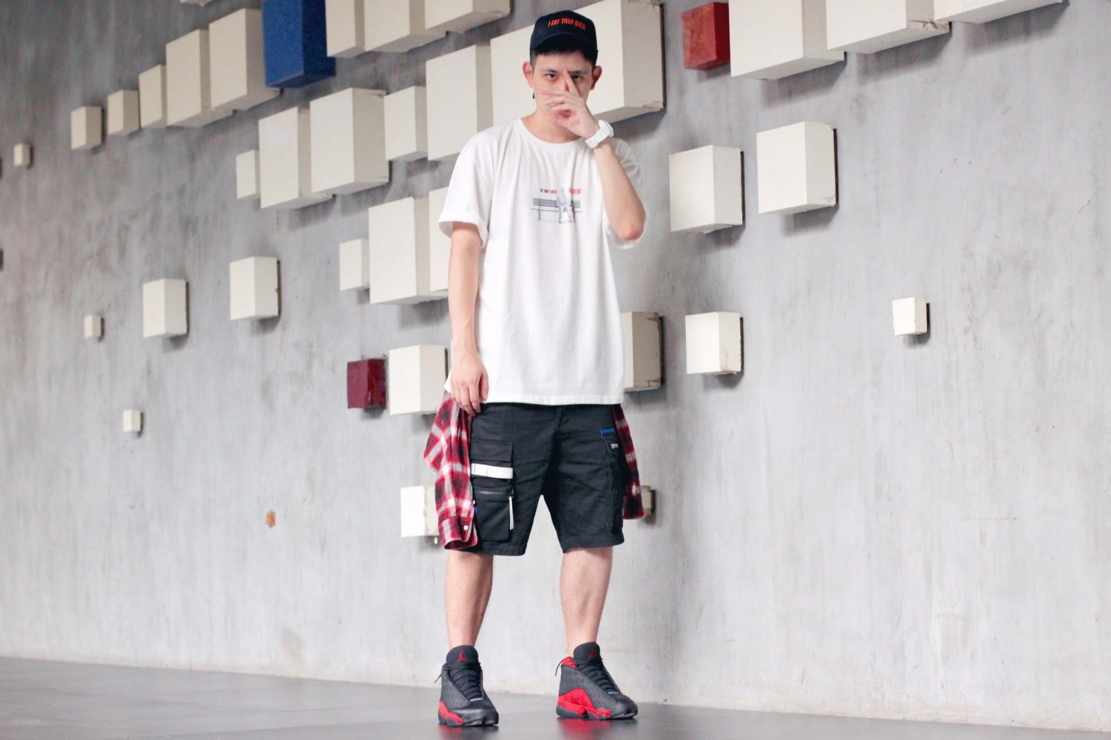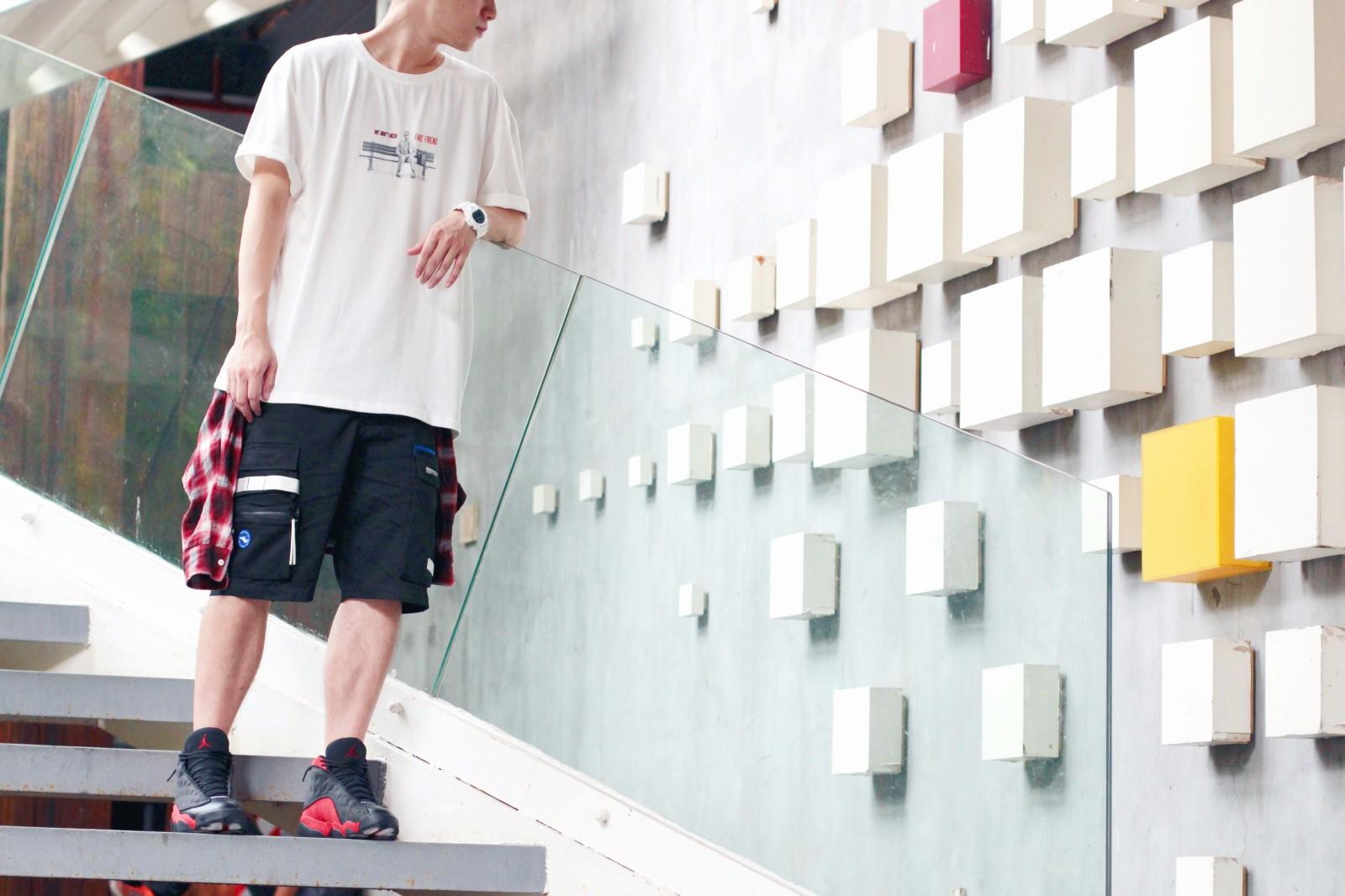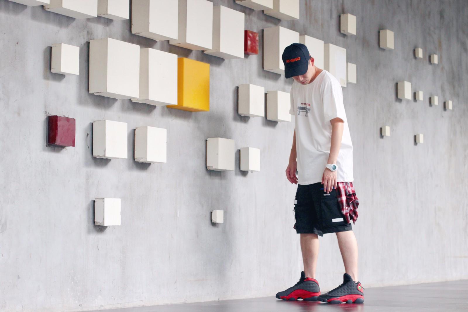 第一款的休闲搭配,我们采用白色街头Tee+黑色工装短裤+Air Jordan 13 “Bred”的组合,并将黑红色的格子衬衫穿插在工装裤间,做到视觉平衡。