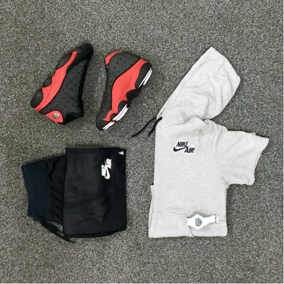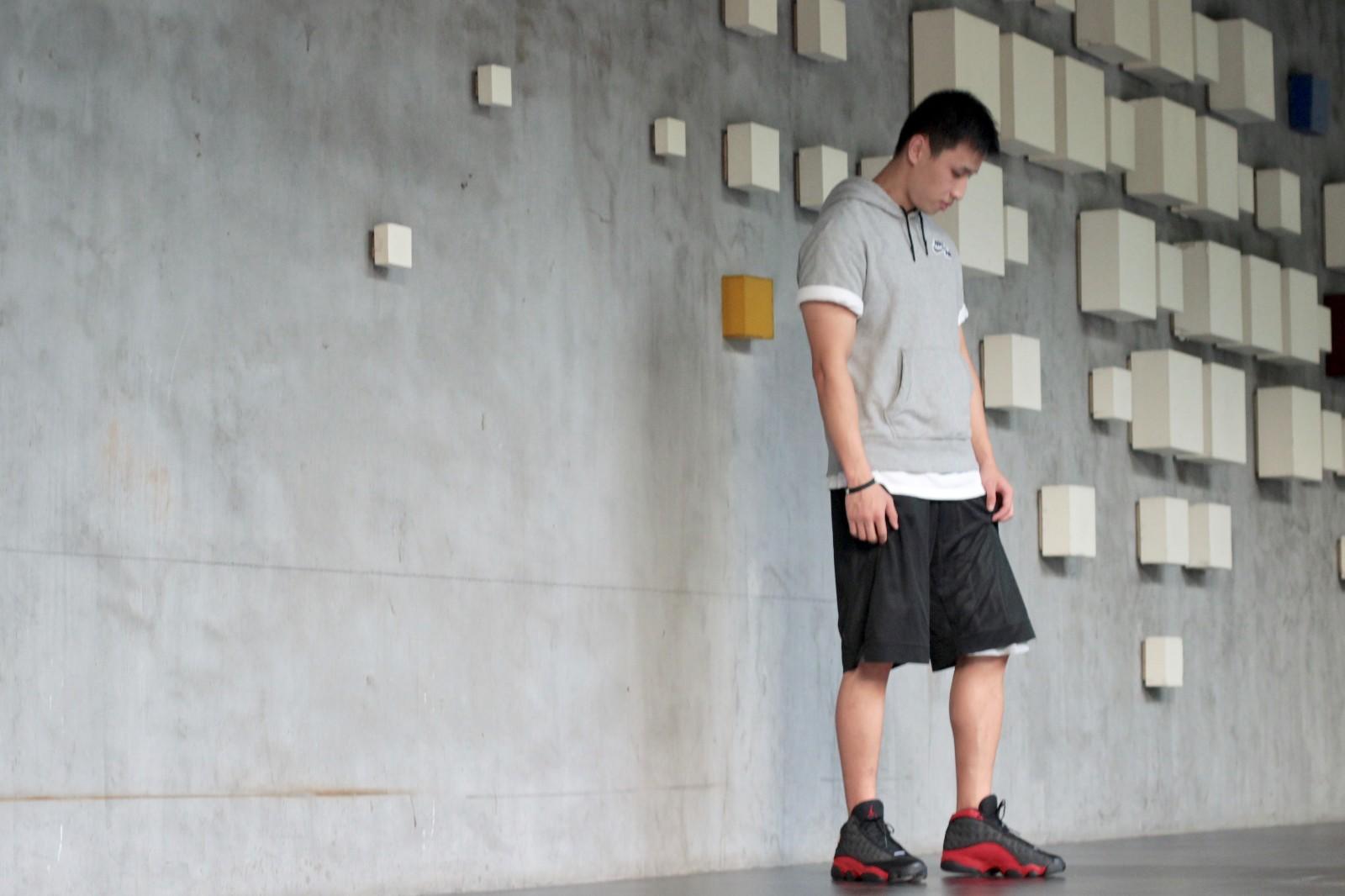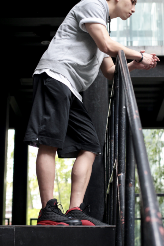 街头搭配上,我们选用了“短袖帽衫+黑色双层篮球短裤+Air Jordan 13 Bred”的整体搭配,将街头风格无限放大。