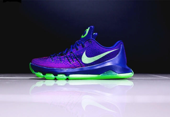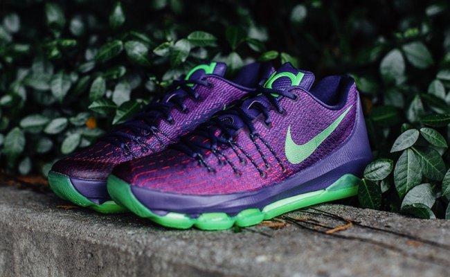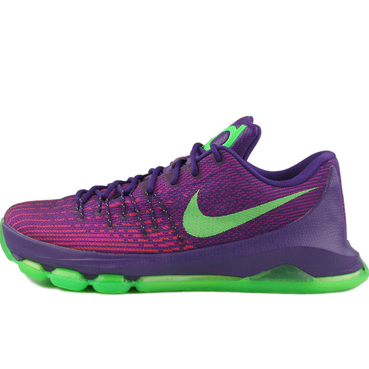 杜兰特进入联盟以来,便展现了巨星的天赋,经过短短几年的磨练,他已经成为了MVP的有力竞争者。为了庆祝他获得职业生涯的第一个MVP奖杯,NIKE以他演讲的西服为灵感,打造了这款suit配色的KD8。鞋子以紫色为主色调,用绿色进行点缀。