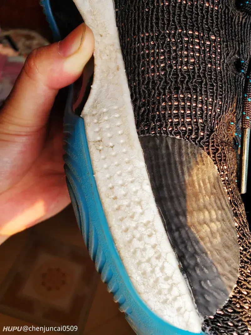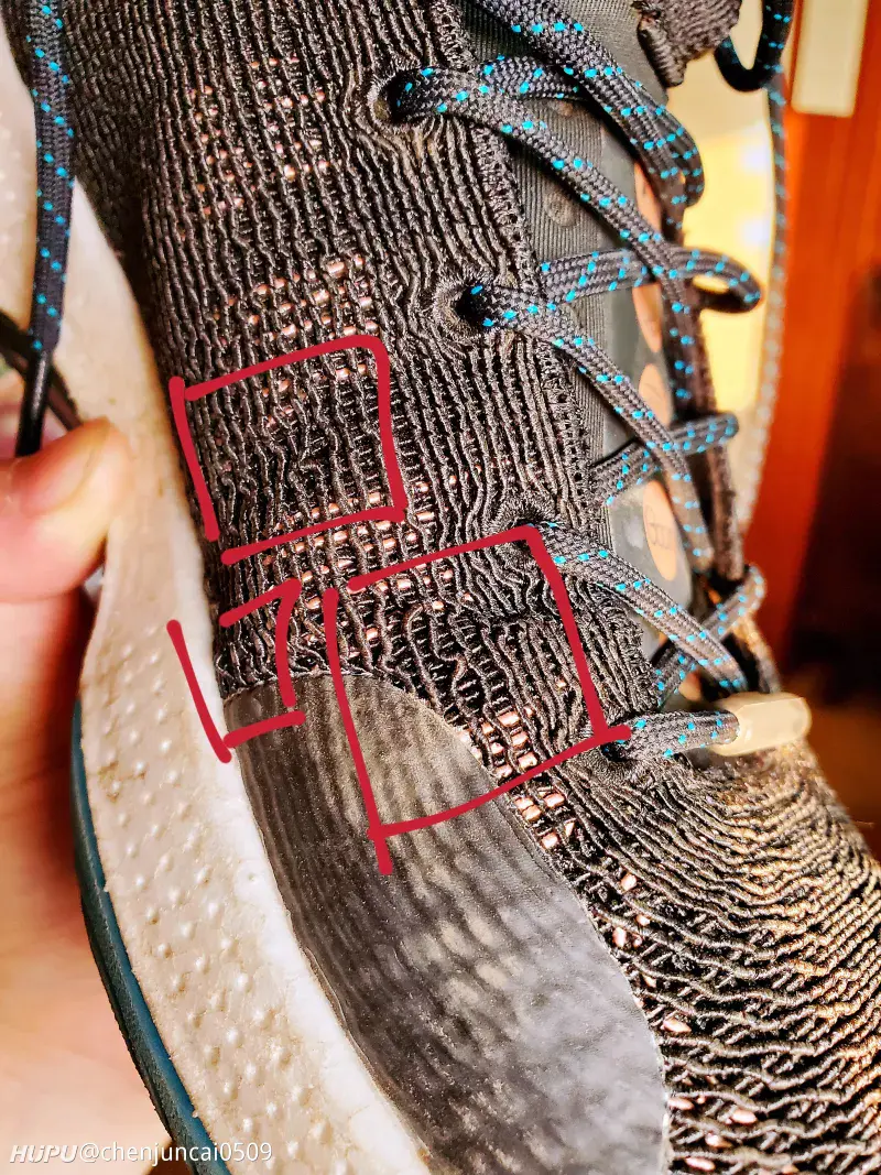 3.驭帅13䨻的外层编织鞋面属于那种较硬并且稀疏的编织方式,所以可以看出,经常弯折的点,会导致编织的线突出来,本来没多大的事,但是我经过6天的实战发现,随着穿着次数的提高,那个线会越来越突出来,我不知道最终究竟会突出多少来,也不知道会带来何种影响,但是确实这个是个小问题,甚至我担心会在突破的时候把线给磨断。