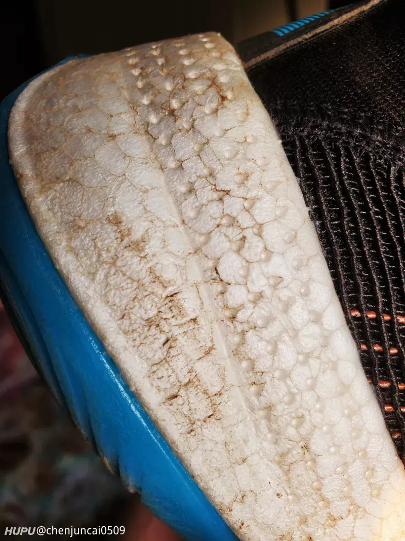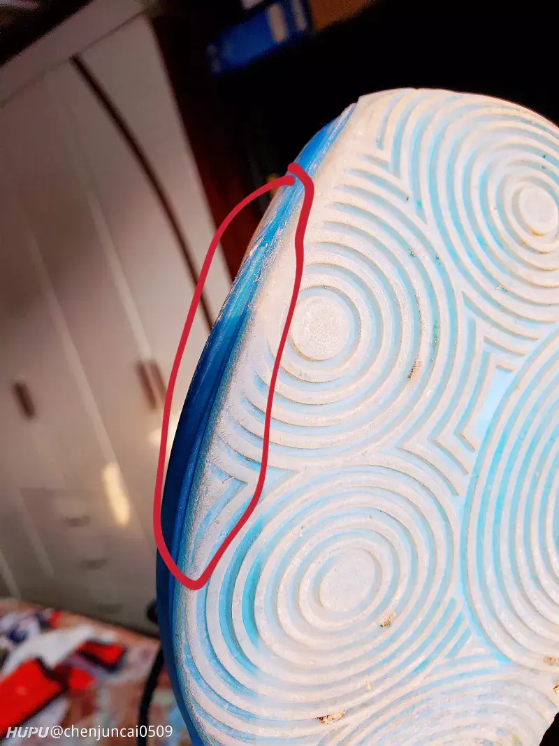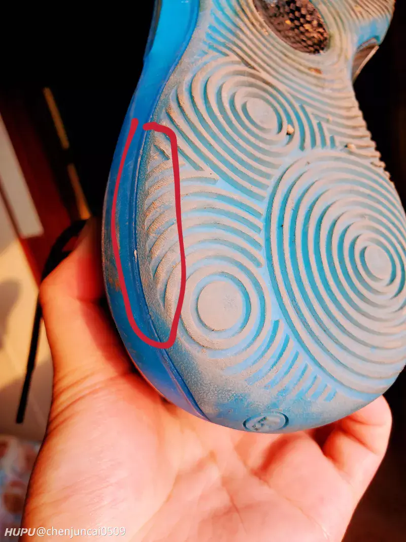 1.䨻材料的耐用性,这里的耐用性不是指衰减,而是䨻材料像泡沫一样,硬度不够,因为内侧的䨻没有进行包边,在突破过程中难免与地面发生摩擦,从而导致䨻很容易就会产生裂纹,甚至可能直接被刮掉一块。图上明显的看到因为与地面的剐蹭产生了很多裂纹,并且还有起皮现象。如果真的是打外场,暴力打法和突破流的JR要多注意了。