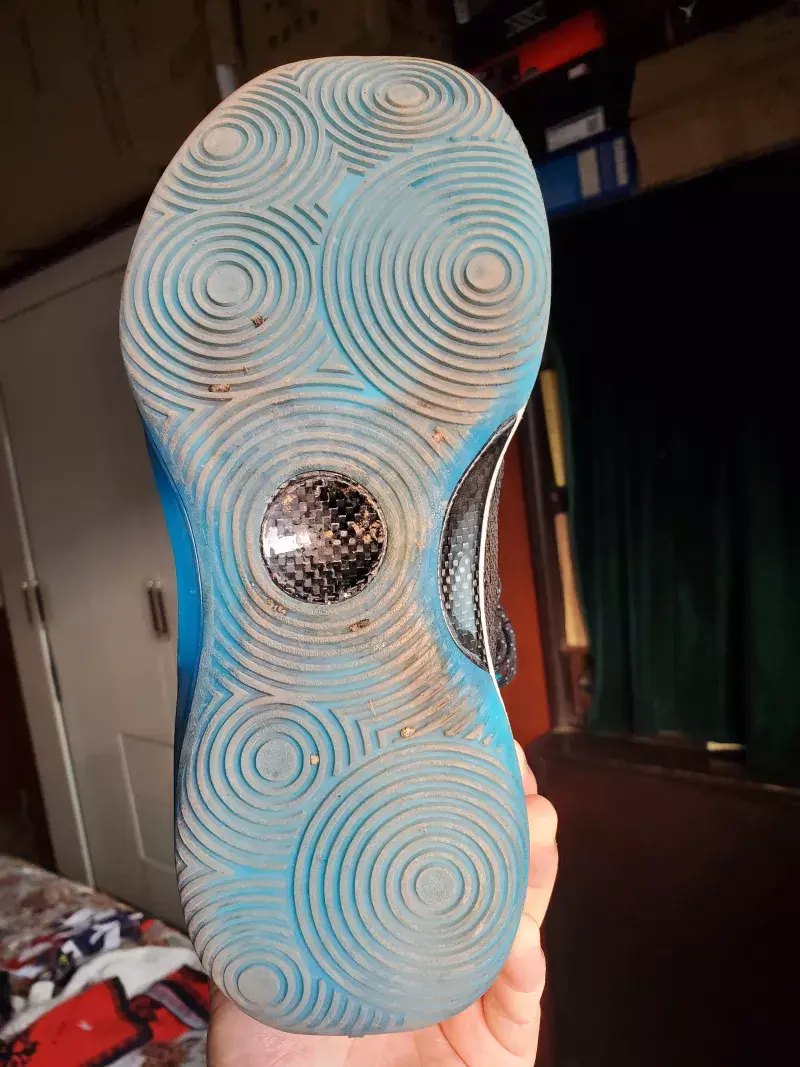 抓地:8.5分。首先说一下,孔雀蓝的整体抓地表现是优于其他三个配色的,感觉在外底做出了加强。驭帅13䨻的四个配色在有灰和保养不怎么好的木地板上都会出现打滑的现象,抓地表现不怎么好,这一点扣一分,接下来就是场外的颗粒塑胶地,孔雀蓝的配色抓地要优于其他三个配色,在同一个场地,黑色也有打滑,但是孔雀蓝却极少出现这个问题,并且回到老家之后,打的光滑贴皮塑胶,保养不好,灰尘很多,但是孔雀蓝的表现可以用很好来评价。急停急起什么的都没问题,最主要是2号我开了3个多小时的车子回老家,身体状态不是很好,但是下午仍然去打了篮球,中锋抢下篮板传给我到三分线外,但是力量过重,我不得不加速一下,结果急停的时候,因为脚踝力量不够,鞋子已经定死在地面,导致我內翻摔倒了。所以如果打外场,不用担心抓地力。