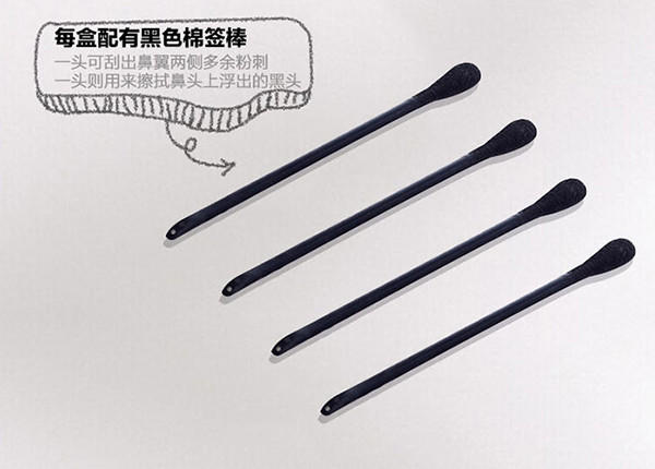 然后轻轻按压清理软化黑头,黑色棉签棒每一个鼻贴里面都有赠送。