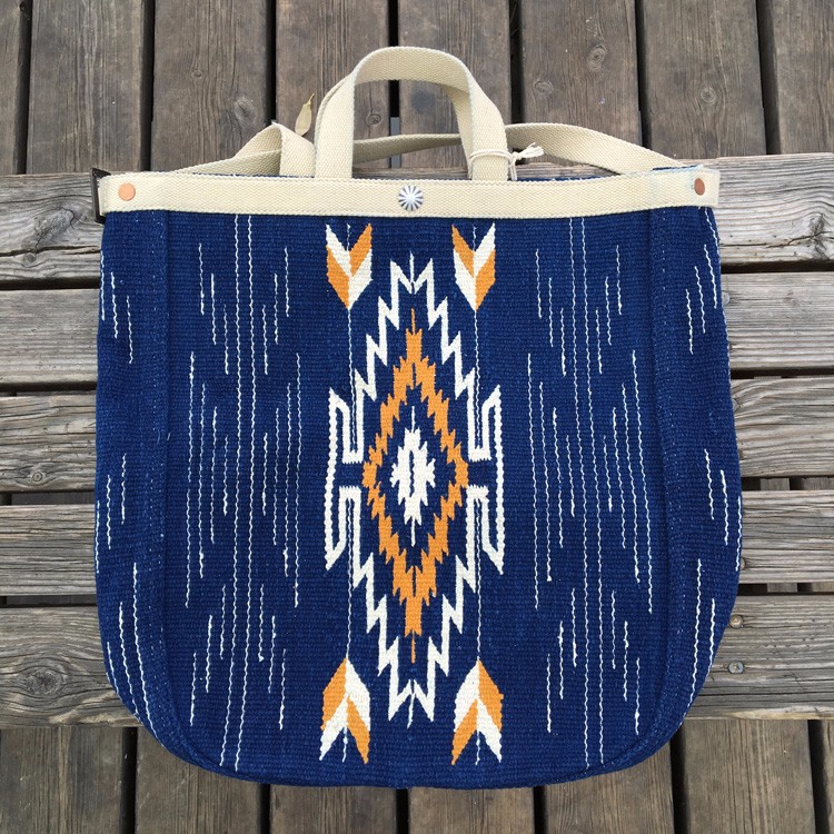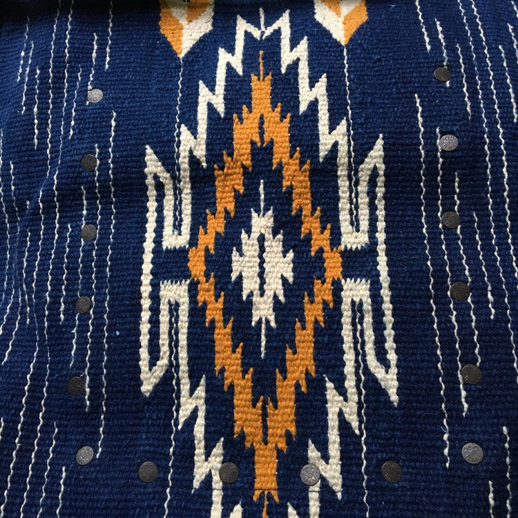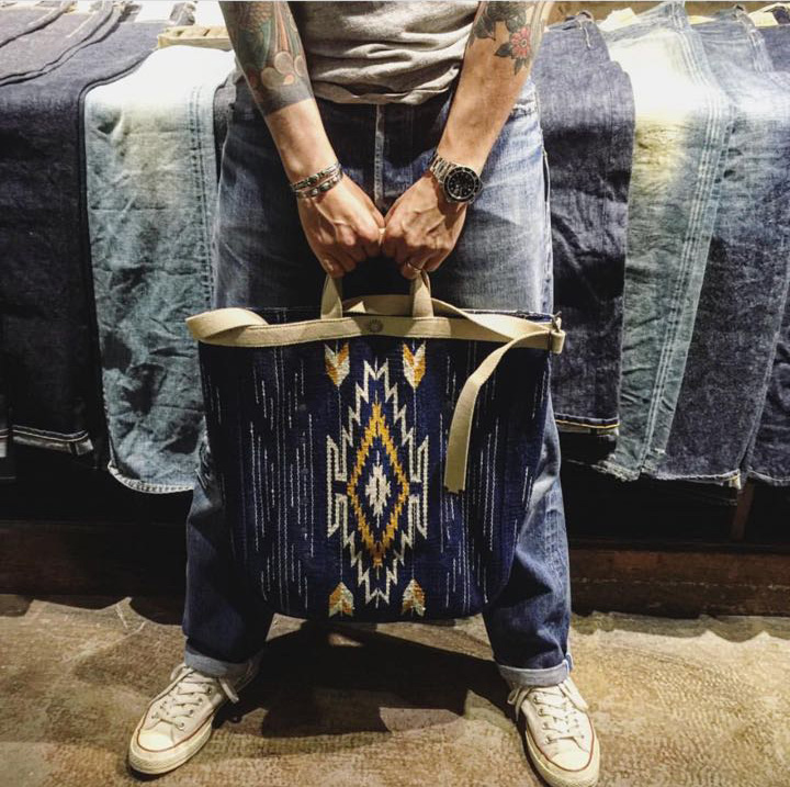 RRL的大号单肩手提背包,包身采用老库存的印第安毛毯,经过true indigo天然蓝染,视觉感强烈,蓝得非常怡人养眼,大面积的印第安风格图案风格非常明快,采用sashiko刺子首发在包身加入波浪细节,极品无需多言。