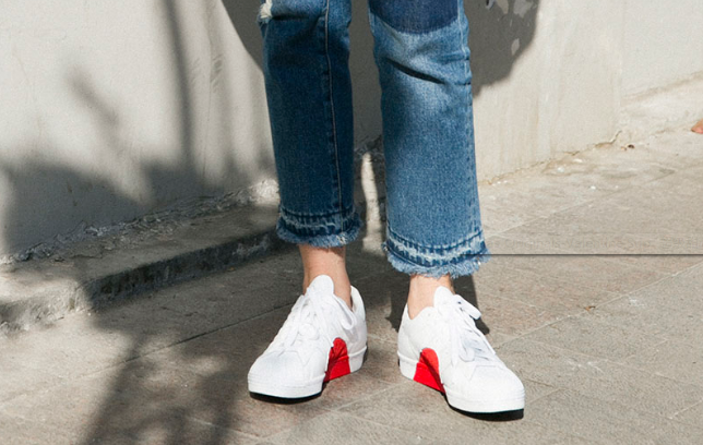 鞋子依旧延续了近年大热的小白鞋设计,整体除了白色以外就只有简单勾勒图案的黑色以及些许代表着情人节的红色元素。
