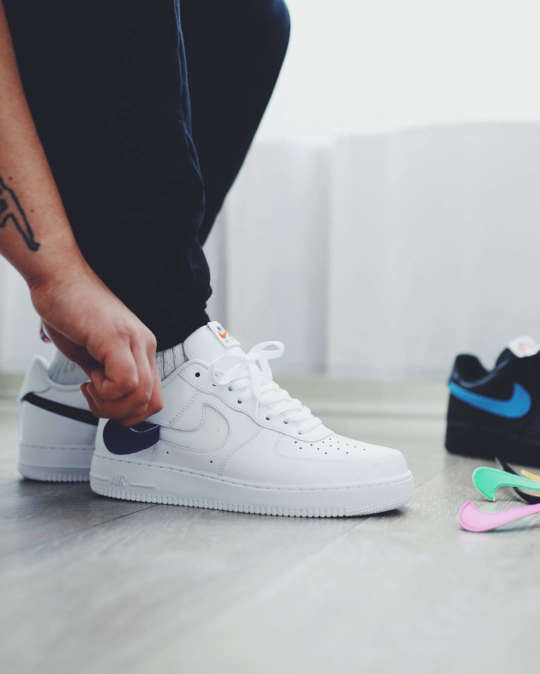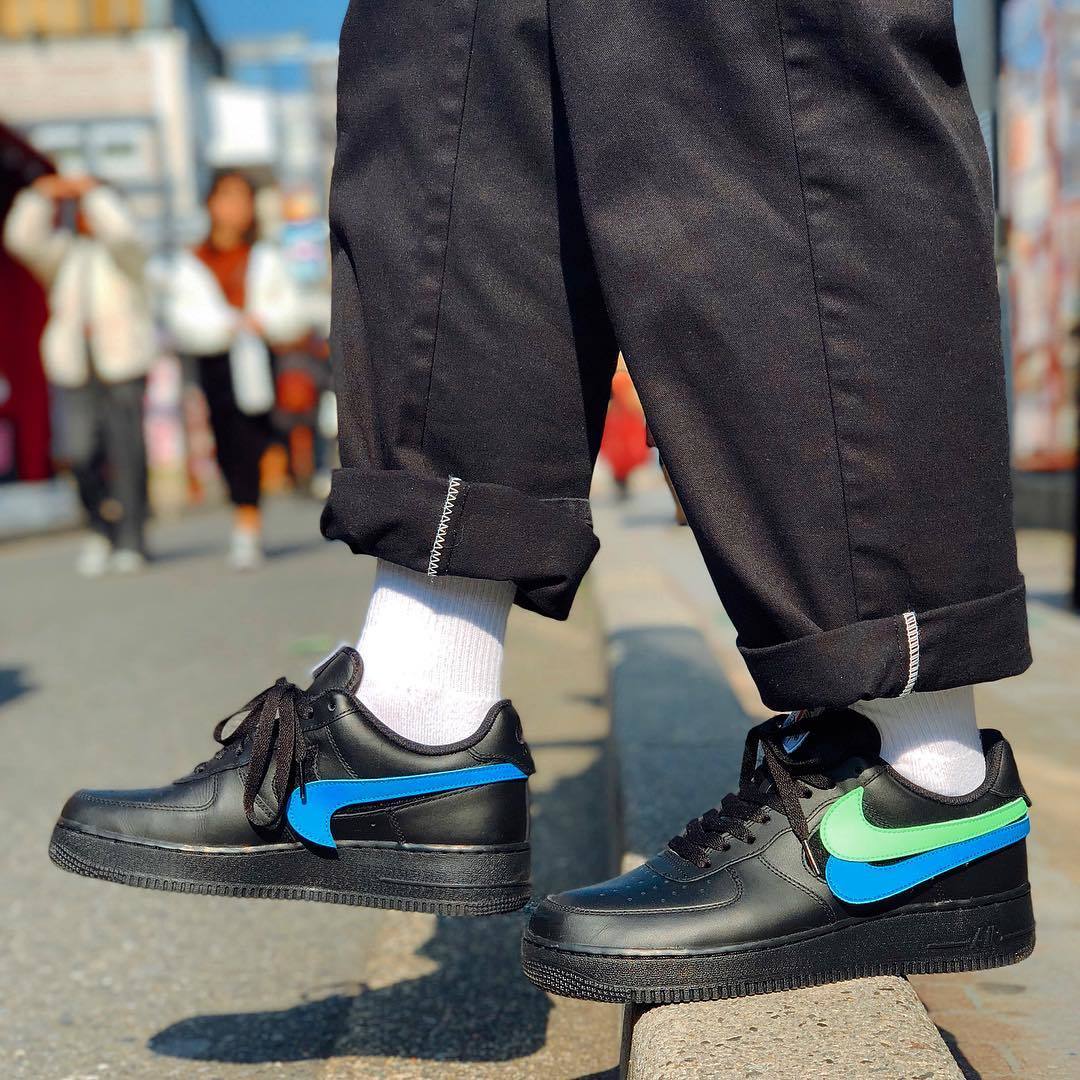 基于经典黑、白款的配色方案,在鞋舌和侧身Logo处加入魔术贴设计,并附赠了多色可替换 Swoosh,除了配色本身带有的同色 Swoosh 外,用户还可自由更换包括黄、紫、蓝、红以及绿在内的5对 Swoosh,最重要的是玩法多元,甚至可以一次性贴上二到三个乃至更多 Swoosh!