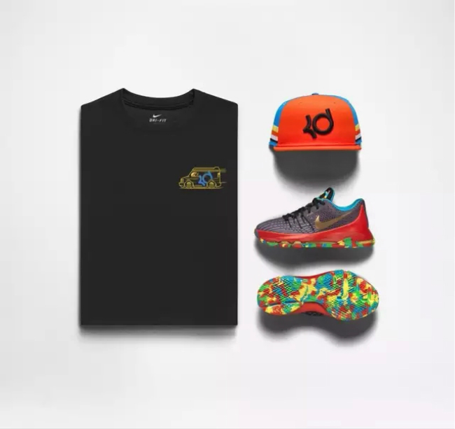 在KD成为NBA巨星之前,他的梦想是当一名气象员。而用一个硬币和几辆迷你玩具车就可以进行的一场极具想象力的篮球赛,相信在KD成为NBA巨星的道路上起到了重要的作用。KD8的鞋垫上印有一枚一分钱硬币,鞋底则采用了一系列汽车模型的颜色。